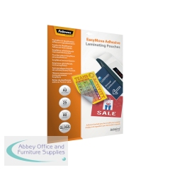 Fellowes Admire EasyMove Adhesive A3 Laminating Pouches 160 Micron (Pack of 25) 5601801. Easy to wipe clean. A3 (303x426mm). 2x80 micron thickness (160 total). High sheen gloss finish. Pack of 25.