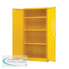Secure storage of flammable liquids chemicals paints and other hazardous substances. Steel construction with reinforced doors and locking. Powder coated yellow finish with label. Floor standing cabinets. H1830xW1220xD459. Non returnable.