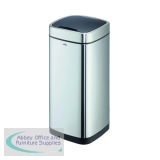Durable Sensor Waste Bin No Touch Square 35 Litre Silver 342323. Opens by motion sensor and closes automatically. Can also be operated manually. Stainless steel. Fingerprint proof coating. Soft-Close function. Requires 4xAA (Not included).