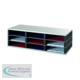 Nine compartment sorter keeps business forms sales literature and active files at your fingertips. Made from high impact polystyrene for long lasting and intensive use. External dimensions: W750 x D328 x H232mm.