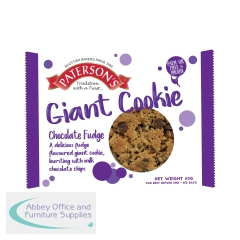 Patersons Giant Cookie Chocolate Fudge 60g (Pack of 18) F5319. Large fudge flavoured cookie with milk chocolate chips. Delicious sweet treat. Flavour: Chocolate Fudge. Free from palm oil. 60g per pack.