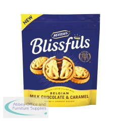 McVities Blissfuls Milk Chocolate and Caramel Biscuits 172g 44825. Crunchy biscuits with smooth creamy chocolate and caramel filling. Suitable for vegetarians. May contain nuts. 172g.