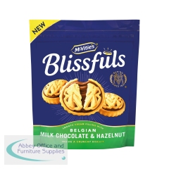 McVities Blissfuls Milk Chocolate and Hazelnut Biscuits 172g 44824. Crunchy biscuits with smooth creamy chocolate and hazelnut filling. Suitable for vegetarians. Contains nuts. 172g.