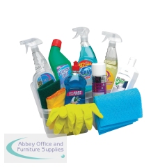 Spring Cleaning Kit. Contains cleaning cloths rubber gloves duster scourer and a selection of fluid cleaners to clean and freshen the home or office hygienically.