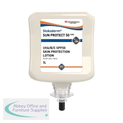 Deb Stokoderm Sun Protect PURE. Refill for your Deb Stokoderm dispenser. SPF50 with UV-A, UV-B and UV-C protection. Ideal for outdoor workers. Silicone free. 1 litre capacity.