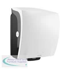 Tork Elevation Centrefeed Dispenser White 559000. High capacity wiper roll dispenser. Lock mechanism. One hand operation makes it easy to use. Sturdy plastic construction. Dimensions: 227x239x360mm (WxDxH).