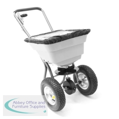 Salt Spreader with Rain Cover Grey 36kg 425728. Adjustable spread up to 366m. Large, wide-profile pneumatic tyres. Hopper-screen. Corrosion-resistant PP hopper with a metal frame. Use with white de-icing salt/ice melt (not suitable for brown rock salt).