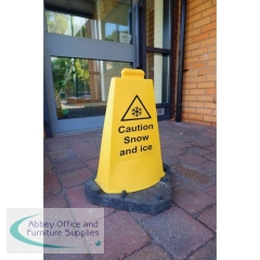 2-Sided Winter Hazard Cone Yellow 427052. Heavy duty cone sign warns of temporary hazards. Quick to deploy. LDPE cone with recycled PVC base. Nestable for easy storage. (HxW): 480x330mm. Weight: 38kg.