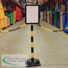 Post and A4 Sign Holder Plastic Yellow/Black 426953. Ideal for use as a temporary or permanent solution to communicate hazards and dangers. Signs simply slide into the frame which attaches to the plastic post. Post (HxDia):800x40mm.