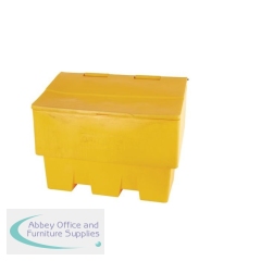 Rota-moulded Stackable Grit Bin Yellow 285L 380177. Heavy duty durable plastic with rigid structure. Strong through-rod hinge system to combat vandalism. UV stabilised polyethylene. Fork liftable from base. LxWxD:730x1085x500mm. Salt available separately.