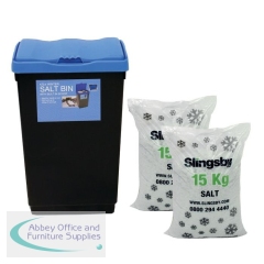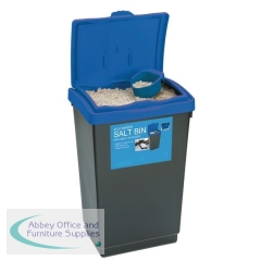 Economy Salt/Grit Bin Kit Black/Blue 47L 389114. 47L bin + 30kg of high purity de-icing salt. Tough, durable plastic. Includes scoop. Lid of the bin is designed to channel water away from the container. Bin holds up to 40Kg salt. HxWxD:590x370x280mm.