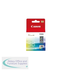 Canon CL-38 Inkjet Cartridge Tri-Colour Cyan/Magenta/Yellow 2146B001. Tri-colour cartridge (C/M/Y). Page yield: up to 200 pages. Compatible with Canon PIXMA printers. Standard yield. Capacity: 9 ml. ChromaLife100 system. Genuine Canon product.