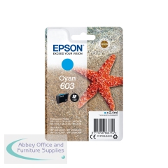 Epson Starfish 603 Ink Cartridge Cyan C13T03U24010. The cartridge contains 2.4ml of ink with a standard print yield of up to 130 pages. This pack contains 1 cyan ink cartridge. For compatible Epson Expression Home and WorkForce printers.