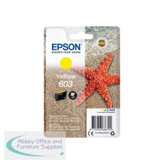 Epson Starfish 603 Ink Cartridge Yellow C13T03U44010. The cartridge contains 2.4ml of ink with a standard print yield of up to 130 pages. This pack contains 1 yellow ink cartridge. For compatible Epson Expression Home and WorkForce printers.