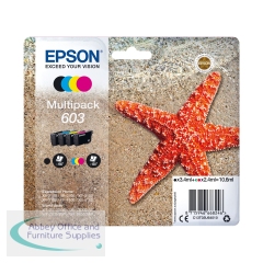 Epson 603 Ink Cartridge Starfish Multipack CMYK C13T03U64010. Black cartridge contains 3.4ml of ink with a print yield of up to 150 pages. Colour cartridges contain 2.4ml of ink each with a print yield of up to 130 pages.