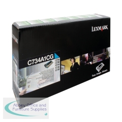 Lexmark Cyan Return Programme 6K Toner Cartridge C734A1CG. Compatible with: C734dn, C734dtn, C734dw, C734n, C736dn, C736dtn, C736n, X734de, X736de, X738de, X738dte. Original Lexmark 6K colour laser toner cartridge. Standard yield.