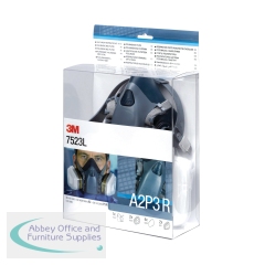 3M Half Mask and Filter Kit 7523L. Ready to use kit with half mask respirator and A2P3 filter. Protects against organic vapours and particulates. Low profile design allows for a wider field of vision. Lightweight for comfort.