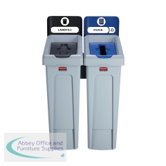 Rubbermaid Slim Jim Recycling Station 2 Stream Black/Blue 2057605. 2xSlim Jim containers, connector, closed lid insert black, paper lid insert blue, 1xbillboard black, 1xbillboard blue. Venting channels for easy liner removal. Cinch grip.