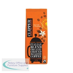Clipper Fairtrade Italian Style Roast and Ground Coffee Organic 227g CTN266. For use with coffee makers. Strength 4. Arabica beans from South America, Africa, Papua New Guinea. Fairtrade. Soil Association organic certified.