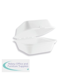 Vegware Bagasse Takeaway Boxes 6 inch White (Pack of 500) B003. Disposable. Burger clamshell 2-compartment design. Made from recycled sugarcane fibre. Lid and base are equal depth. For hot/cold food. Does not trap condensation, food stays crispy.