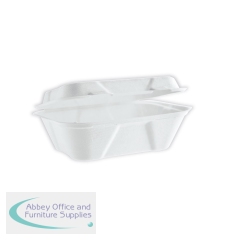 Vegware Bagasse Takeaway Box Clamshell 7x5 inch White (Pack of 500) B001. Disposable. 2-compartment clamshell design. Made from recycled sugarcane fibre. For hot and cold food. Designed to not trap condensation so food stays crispy.