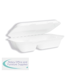 Vegware Bagasse Takeaway Box 2 Compartment 9x6 inch White (Pack of 200) B002. Disposable. Made from recycled sugarcane fibre. For hot and cold food. Designed to not trap condensation so food stays crispy.