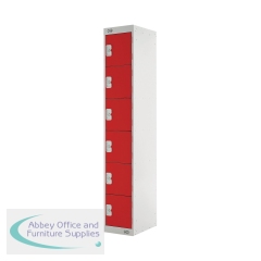 Six Compartment Locker 300x450x1800mm Red Door MC00071. Fitted with recessed cam deadlock and supplied with two keys per lock. Ventilated. Capacity Weight: 19kg Per Compartment. Non-returnable.