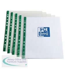 Oxford A4 Clear Punch Pocket. Protects files with clear visibility of documents. Featuring green, reinforced, punched spines and suitable for ringbinders and lever arch files. Colour: Clear.