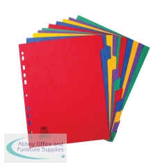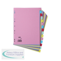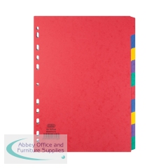 Elba 10-Part Pressboard Divider Heavyweight A4 Bright Multi 400007513 A4 10 Part virant, heavyweight pressboard dividers. Multi-punched to fit A4 ring binders and lever arch files. Tabs can be written or typed on. Colour: Assorted. Size: A4.