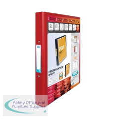 Elba Vision 25mm 2 O-Ring Presentation Binder A4 Red 100080890. Clear, side loading pocket on the front cover ideal for personalised presentations. Label holder on spine for easy reference.