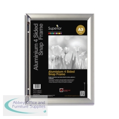 Seco Snapframe A3 Silver AM8-A3SV. Wall mounted snap frame sign holder. Anti-glare PVC cover to protect display content. Four-sided snap frame for easy content change. Display area A3. Supplied with fixing kit. Colour: Silver.
