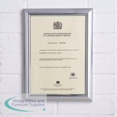 Seco Premium Certificate Holder A4 Silver SVA4CERT. Size: A4. Plexiglas front that is flexible and resistant to breakages. Suitable for wall mounting or self standing. Back loading design. Colour: Silver.