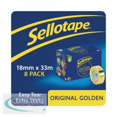 Sellotape Original Golden Tape 18mmx33m (Pack of 8) 1443251 sticky tape. Extra strong and extra sticky. Golden in colour, but clear when applied. Easy tear, no need for teeth. Small core. Size: 18mm x 33m. Pack of 8.