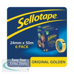 Sellotape Original Golden Tape 24mmx50m (Pack of 6) 2928285. Extra strong and extra sticky tape. Golden in colour, but clear when applied. Easy tear for quick application. Anti-tangle for better control.
