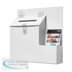 Free standing or wall mountable white plastic suggestion box with 110mm wide literature pocket. Includes wall mounting fixings lock and two keys. Ideal for voting slips suggestions raffle tickets comment cards and more. W349 x D92 x H330mm.