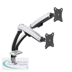 Contour Ergonomics Economy Dual Desk Mounted Monitor Arm Black CE10187. Height adjustment enables precision alignment of multiple screens. Swivel ability for multiple screen viewing angles. Detachable VESA plate design enabling easy installation.