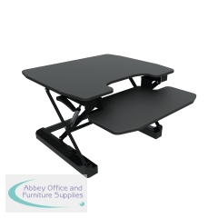 Contour Ergonomics Ultra Slim Sit/Stand Desk Converter Workstation Black CE10179. Accomodates most users with 6 height settings. Ultra slim profile minimises bulk. Squeeze handle to adjust height. Anti-skid pads prevent scratches. Rugged construction.