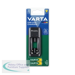 Varta USB Duo Charger AA+AAA + Recharge Batteries 2x AAA 57651201421. Detects unsuitable/defective battery cells. Blue LEDs. Features: 10 hour safety timer, wrong polarity, short circuits. Charges 2x AA/AAA batteries in 10hr. Includes a micro USB input.