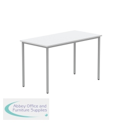 Astin Rectangular Multipurpose Table 1200x600x730mm Arctic White/Silver KF77740. 25mm top thickness. Provides stability, legroom, and versatile configurations. Frame Colour: Silver. Colour: Arctic White. Dimensions (WxDxH): 1200x600x730mm.