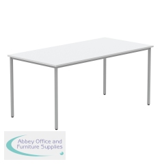 Astin Rectangular Multipurpose Table 1600x800x730mm Arctic White/Silver KF77743. 25mm top thickness. Provides stability, legroom, and versatile configurations. Frame Colour: Silver. Colour: Arctic White. Dimensions (WxDxH): 1600x800x730mm.