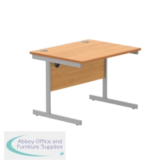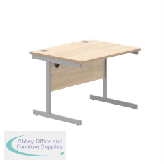 Astin Rectangular Single Upright Cantilever Desk 800x600x730mm Oak/Silver KF800046. Durable, spacious rectangular office desk. Suitable for use in any setting. 25mm thick desktop. 80mm cable ports fitted as standard. Cantilever legs for stability.