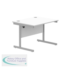 Astin Rectangular Single Upright Cantilever Desk 800x600x730mm White/Silver KF800047. Durable, spacious rectangular office desk. Suitable for use in any setting. 25mm thick desktop. 80mm cable ports fitted as standard. Cantilever legs for stability.