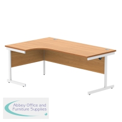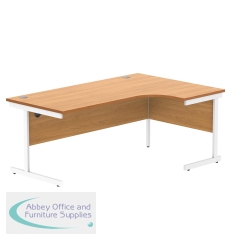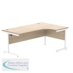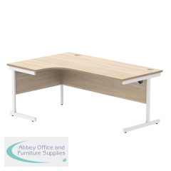 Astin Radial Left Hand Single Upright Desk 1800x1200x730mm Oak/White KF800054. Durable, spacious rectangular office desk. Suitable for use in any setting. 25mm thick desktop. 80mm cable ports fitted as standard. Cantilever legs for stability.
