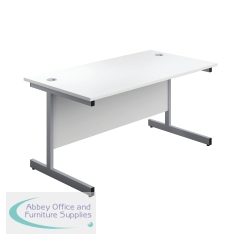 First Rectangular Cantilever Desk 1800x800x730mm White/Silver KF803515. Suitable for a variety of office environments. 25mm thick desktop with dual cable management ports. Leg Colour: Silver. Dimensions(WxDxH): 1800x800x730mm. Non-returnable.
