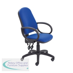 First High Back Operators Chair with Fixed Arms 640x640x985-1175mm Blue KF839243. Comfortable, high back operators chair with Fixed Arms. Back height and angle is adjustable, and can be fixed or free floating. Black plastic 5-castor base. Non-returnable.
