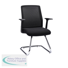 Jemini Denali Visitor Chair 600x580x890mm Black KF70061. Ideal for meeting, waiting rooms, reception spaces. Breathable mesh backrest, durable fabric seat pad. With black fixed arms. Chrome cantilever base and non-marking skid feet. For up to 8 hrs usage.
