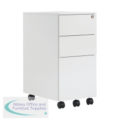 First 3 Drawer Under Desk Pedestal Slimline Steel 300x470x615mm White KF98516. Entry level slimline steel pedestal. Anti-tilt mechanism. Capacity Weight: 40kg Per Drawer. Non-returnable.