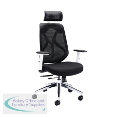 Arista Stealth High Back Chair with Headrest Adjustable Arms Black/White KF80382. Upholstered seat. Mesh back. Synchro mechanism with tilt torsion control. Seat slide. Adjustable lumbar support. Seat: 480x510mm. Back: 440x690mm. Seat Height: 440-690mm.