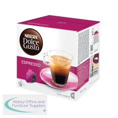 Nescafe Dolce Gusto Espresso Coffee Capsules (Pack of 48) 12423690. Invigorating lighter roast, with sweet, fruity notes and a velvety crema finish. Delicate and fruity. Pack of 48 supplied in 3 boxes containing 16 capsules. Makes 48 drinks.