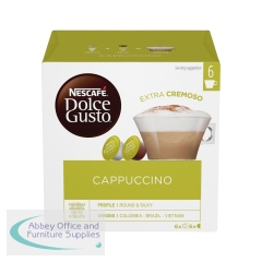 Nescafe Dolce Gusto Cappuccino Coffee Capsules (Pack of 48) 12352725. The deep taste of espresso, combined with velvety foam and textured milk. Round and silky. Pack of 48 supplied in 3 boxes containing 16 capsules. Each pack makes 24 drinks.